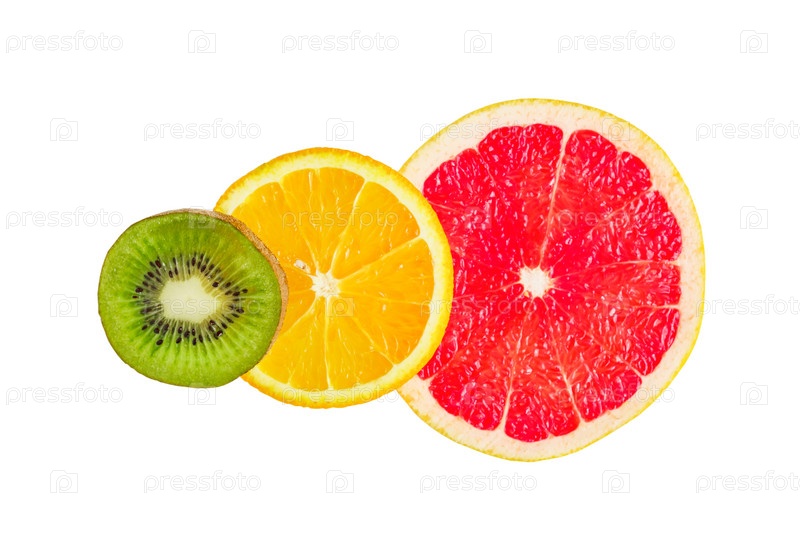 Ломтики цитрусовых - киви, апельсин и грейпфрут, изолированные на белом фоне