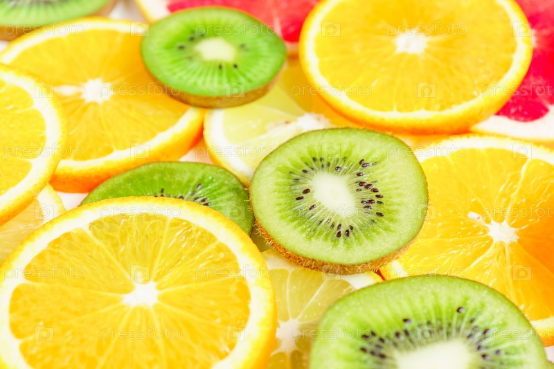 Ломтики цитрусовых - киви, апельсины и грейпфруты на белом фоне. Фруктовый фон
