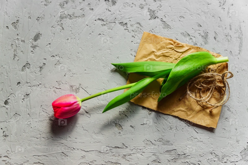 Вид сверху на свежий цветущий красный тюльпан на крафт-бумаге и сером текстурированном фоне. Копировать пространство