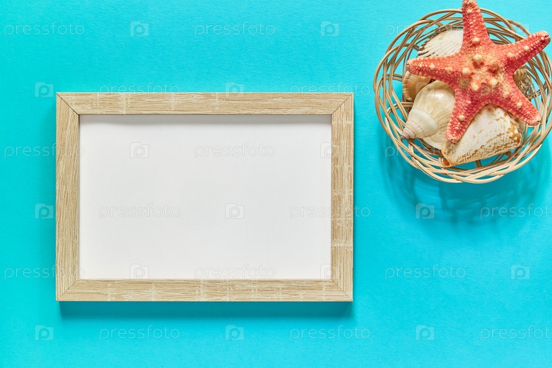Вид сверху на фоторамку с ракушками и морскими звездами на синем фоне. Концепция летних каникул. Морская плоская планировка