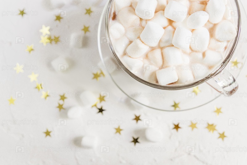 Вид сверху на чашку горячего вкусного какао-напитка с зефиром