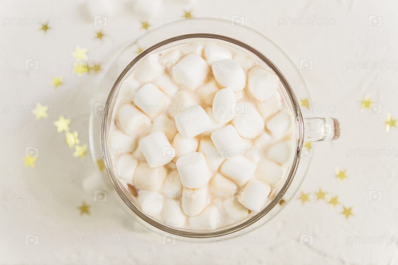 Вид сверху на чашку горячего вкусного какао-напитка с зефиром на фоне золотых звезд