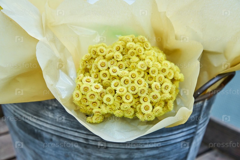 Букет желтых цветков бессмертника, завернутый в крафт-бумагу в металлическом ведре