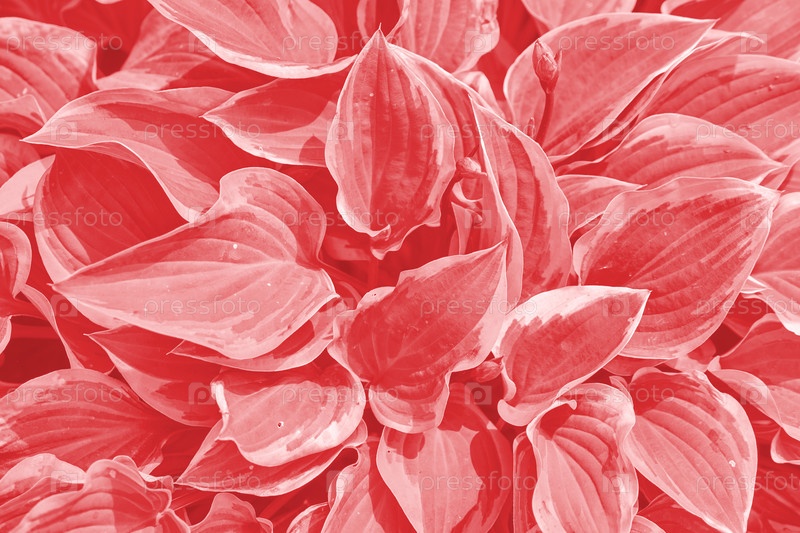 Листья хосты живого кораллового цвета. Вид сверху, фон листвы модного цвета