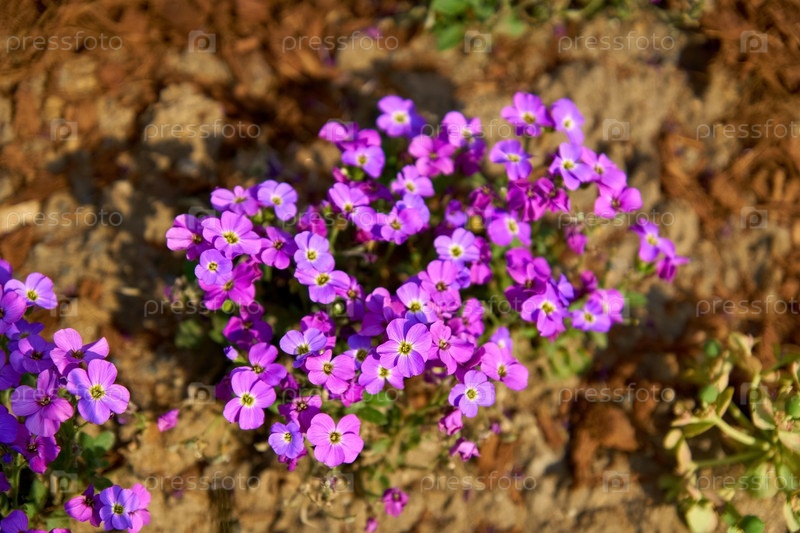 Вид сверху на маленькие фиолетовые цветущие цветы. Летнее поле в цвету