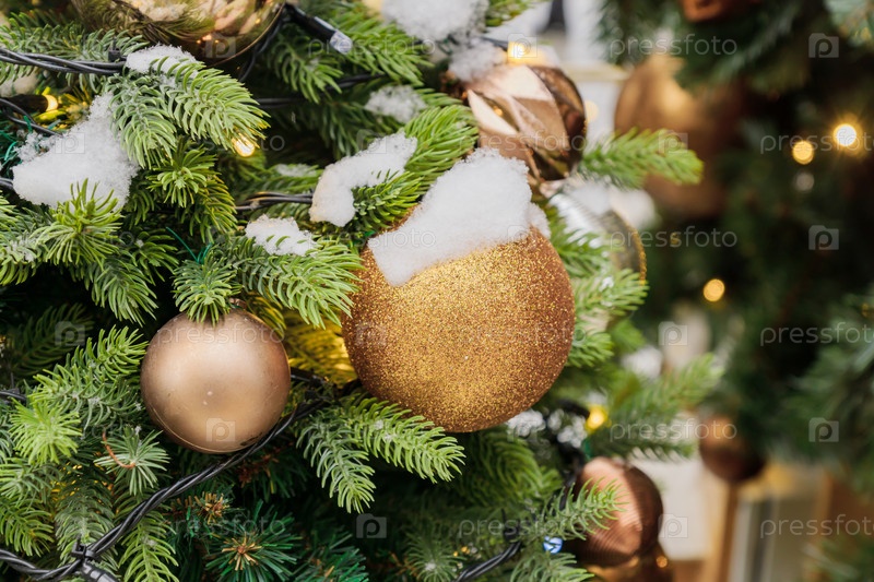 Закройте рождественскую елку, украшенную сверкающими шарами и гирляндой с включенными огнями. Праздничный фон с копией пространства для ваших проектов