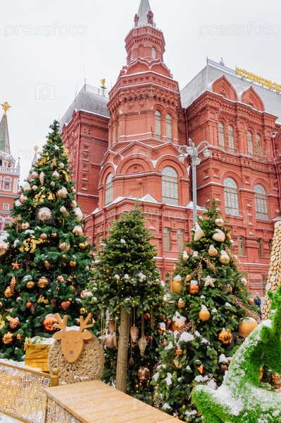 Москва, Россия - 20 декабря 2018 г.: Рождество украсило Манежную площадь в снежный день. Много новогодних елок на фоне Красной площади