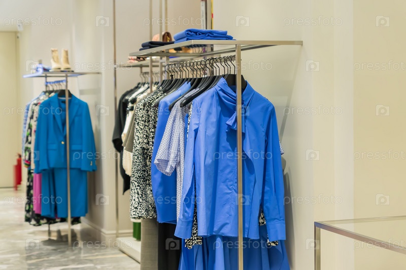 Магазин роскошной и модной женской одежды. Трендовый синий цвет