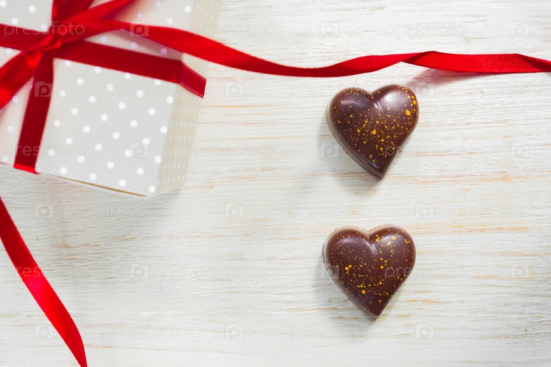 Открытка на день святого валентина. Шоколадные конфеты в форме сердца и подарочная коробка с красной праздничной лентой на деревянном фоне