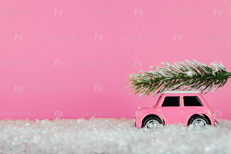 Маленькая розовая игрушечная машинка с елью на заснеженной дороге. Праздничная рождественская открытка