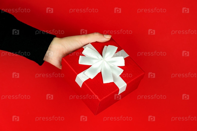Женщина держит красную подарочную коробку на красном фоне. Праздничная открытка на праздники