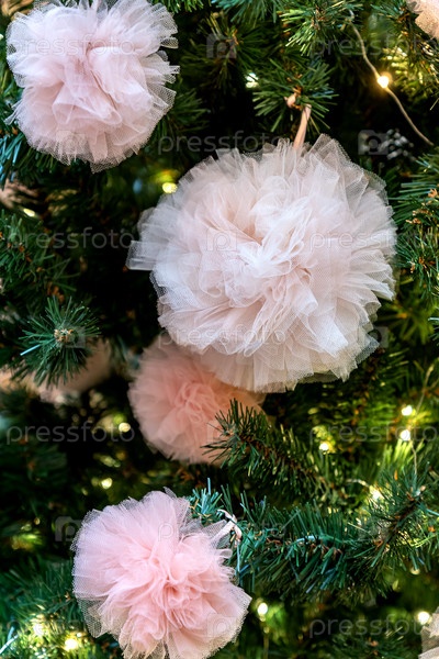 Крупный план праздничной новогодней елки с пушистыми игрушками в пастельных тонах. Модное украшение для зимних праздников