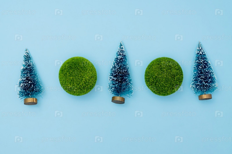 Мини-елки и зеленые шары на синем фоне. Концепция праздника Рождества и Нового года. зимний праздничный сезон. плоская кладка. копировать пространство