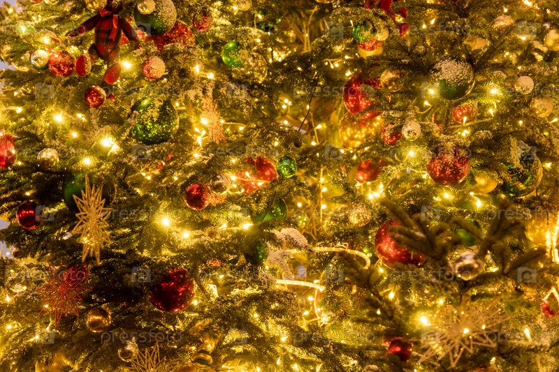 Закройте украшение елки безделушками и гирляндой. Праздничная открытка к зимним праздникам