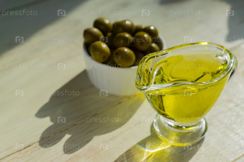Стеклянная кастрюля с оливковым маслом первого отжима и свежими зелеными оливками на деревянном столе
