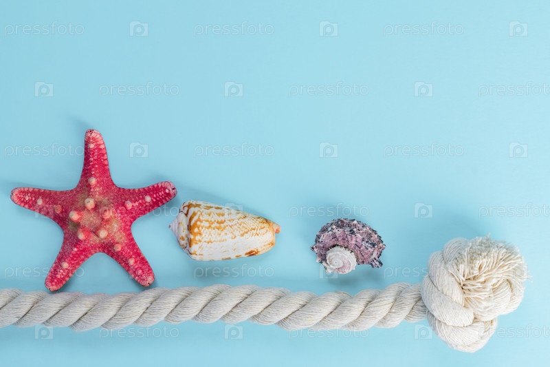 Морские раковины и морские звезды на голубом фоне с копировальным пространством. концепция летнего отдыха и отпуска
