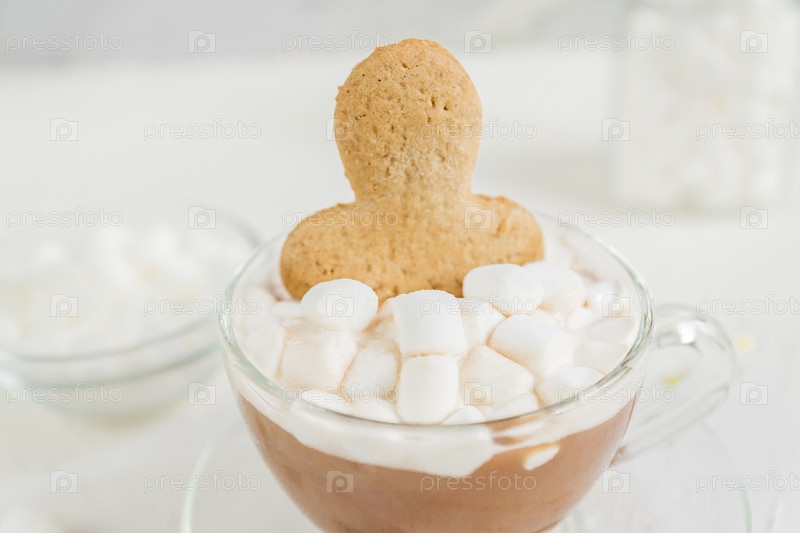 Чашка горячего вкусного какао-напитка с зефиром и имбирным человечком