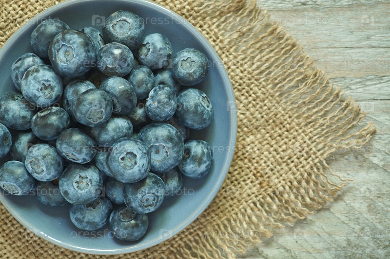 Вид сверху на миску с черникой на деревянном столе и ткани из мешковины. Скопируйте место для вашего текста