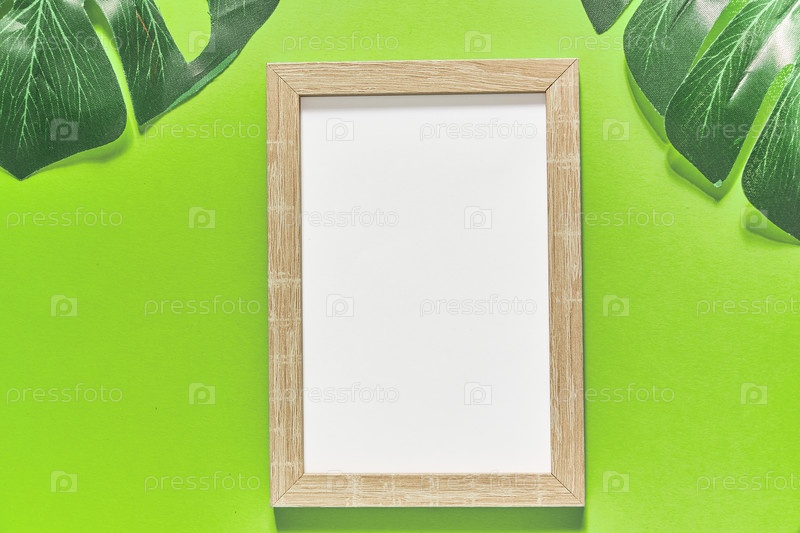 Фоторамка и зеленые листья монстры на зеленом фоне. Модная концепция тропической плоской планировки