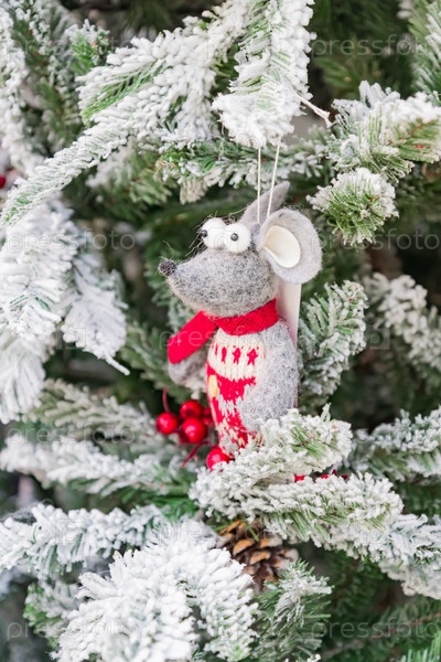 Символ 2020 года. Белая игрушечная крыса в новогодней шапке висит на меховой снежной елке. Праздничное оформление интерьера