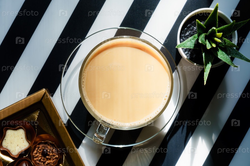 Утренний кофе дома. Вид сверху на горячий кофе с молоком, шоколадные конфеты, украшенные суккулентами в горшках