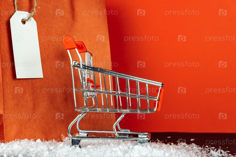 Концепция любителя шоппинга: красные бумажные сумки для покупок и маленькая тележка для игрушек на красном фоне