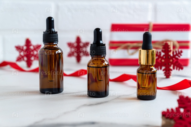 Косметика по уходу за кожей на фоне Рождества. Масло для лица во флаконах из темного стекла с красными снежинками. Праздничная реклама
