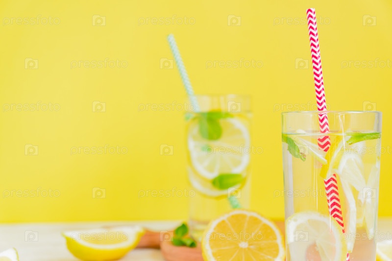 Домашний лимонад с лимоном и мятой на цветном желтом фоне. Летний холодный коктейль. Копипространство