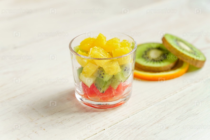 Диета Свежий вкусный фруктовый салат в стеклянной банке на деревянном столе. Нарезанные сочные апельсины, киви и грейпфруты