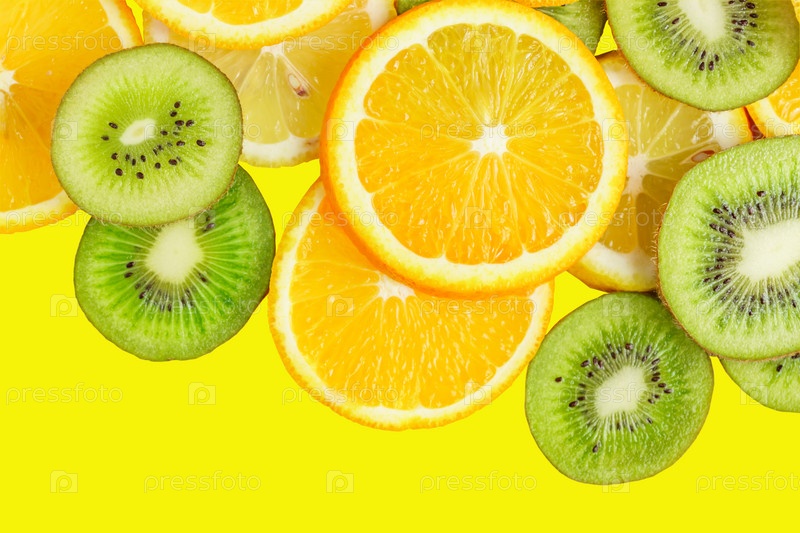 Ломтики цитрусовых - киви, апельсины и лимоны на желтом фоне. Фруктовый фон
