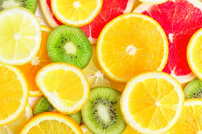 Ломтики цитрусовых - киви, апельсины и грейпфруты на белом фоне. Фруктовый фон