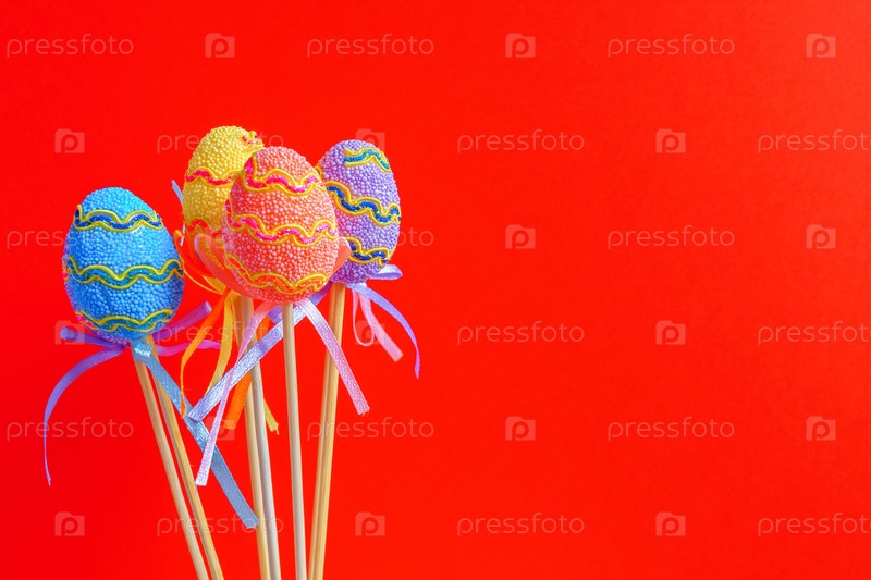 Пасхальные красочные украшенные яйца стоят на палочках на красном фоне. Минимальная пасхальная концепция. Счастливой Пасхи открытка с копией пространства для текста