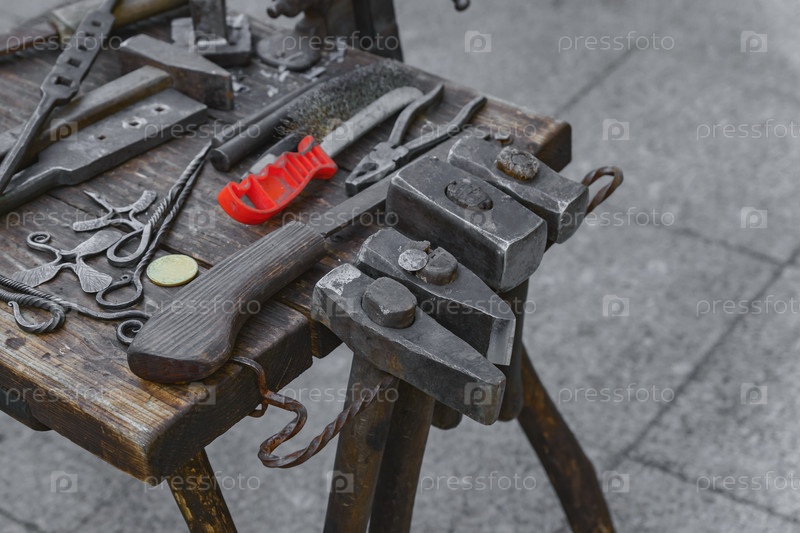 Кузнечные инструменты и рабочее место: наковальня, молотки, кузнечные клещи, огниво