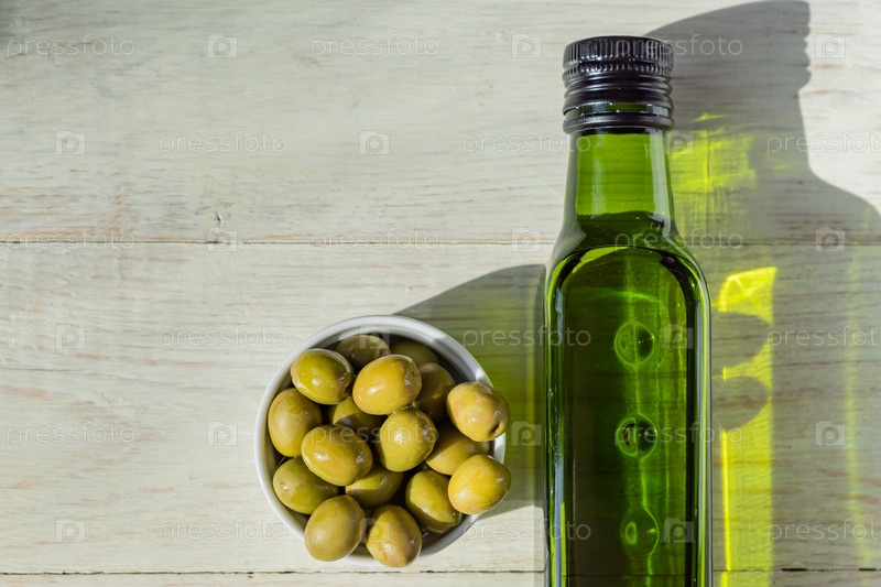 Оливковое масло первого отжима в зеленой бутылке и свежие зеленые оливки на деревянном столе