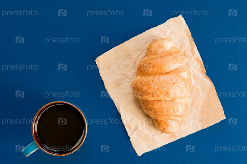 Вид сверху на чашку черного кофе и круассан на крафт-бумаге на синем фоне с копировальным пространством. Утренний завтрак во французском стиле