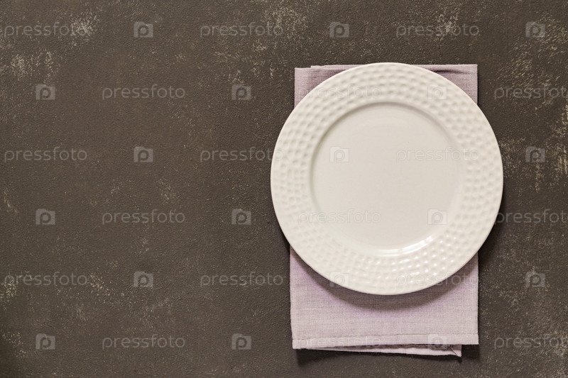 Вид сверху на пустую тарелку, серую текстильную салфетку на черном бетонном фоне. Скопируйте пространство