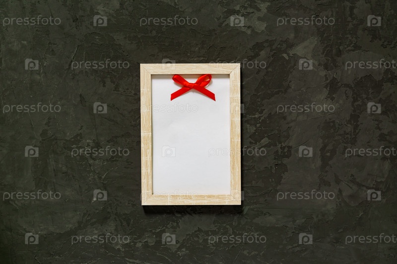 Деревянная фоторамка с красным атласным бантом на черном фоне. Макет