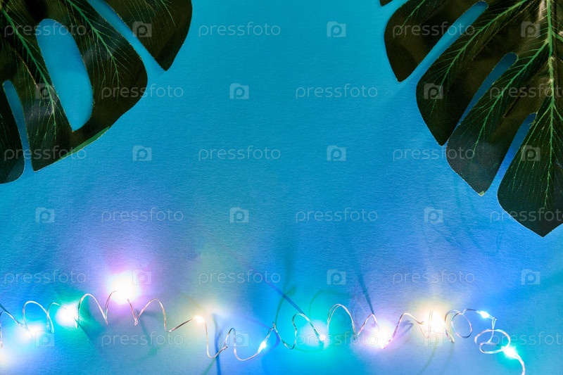 Зеленые листья монстера на синем фоне с неоновой светодиодной подсветкой. Модный тропический фон для ваших проектов