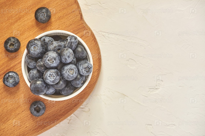 Вид сверху на миску с черникой на деревянном столе и белом бетонном фоне