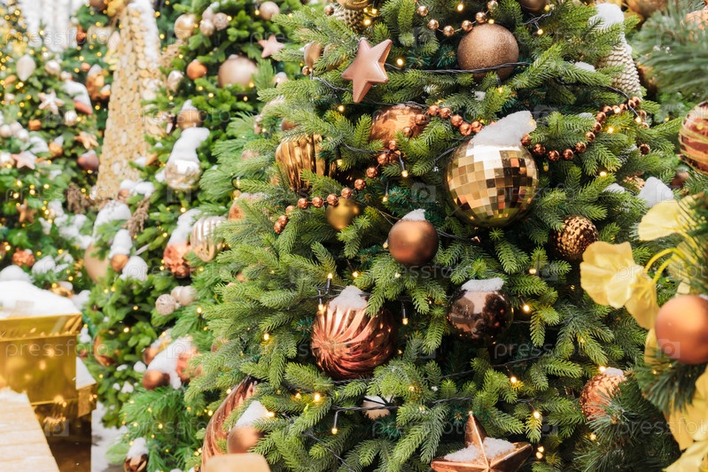 Закройте рождественские елки, украшенные сверкающими шарами и гирляндой с включенными огнями. Праздничный фон с копией пространства для ваших проектов