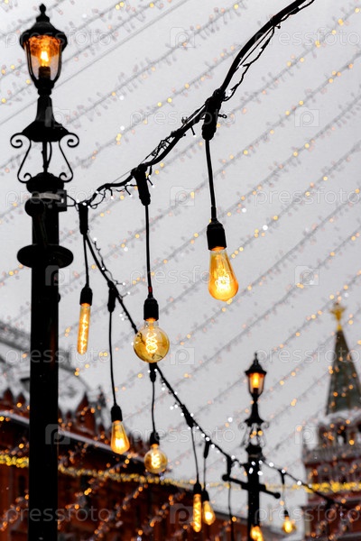 Красивая праздничная иллюминация на улице. Винтажная гирлянда из лампочек на Манежной площади в Москве, Россия