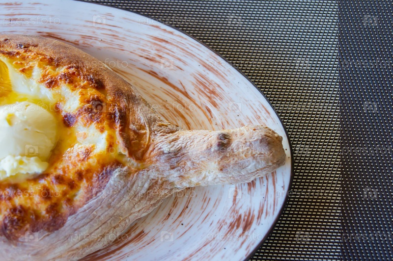 Традиционная грузинская кухня. Аджарские хачапури на тарелке. вид сверху. Открытый пирог с сыром и яйцом