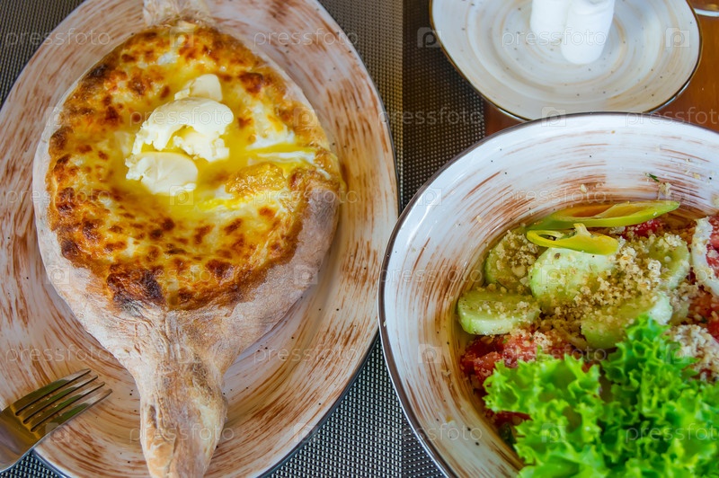 Традиционная грузинская кухня. Вид сверху на аджарские хачапури и грузинский овощной салат с ореховой заправкой