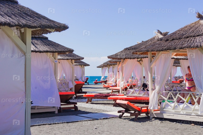 Сочи, Адлер, Россия - 07 сентября 2019 г. - Много бунгало на пляже. Концепция курорта для отдыха