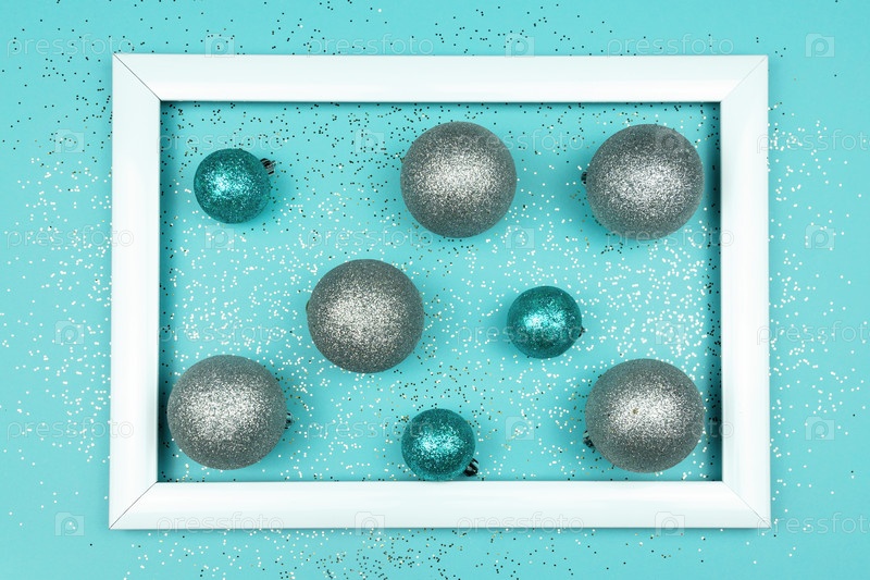 Рамка с рождественскими голубыми и серебряными безделушками. Праздничная открытка на новый год