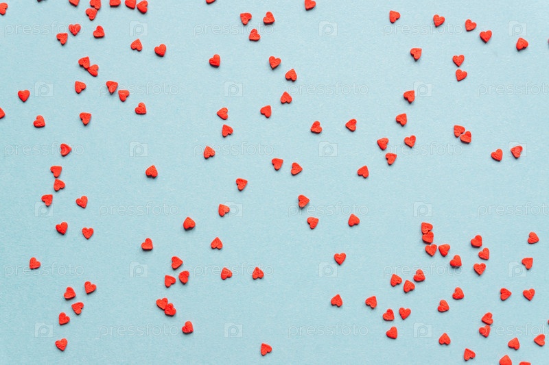 Посыпает фон, сахар посыпает красные сердца, украшение для торта и пекарни. Вид сверху, плоская планировка. День святого Валентина