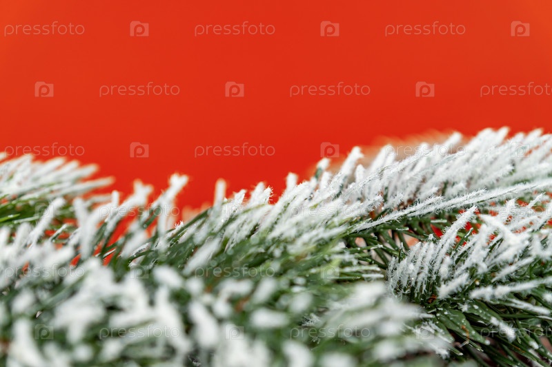 Ветка мехового дерева, покрытая снегом на красном фоне. Праздничный рождественский фон с копией пространства для вашего текста
