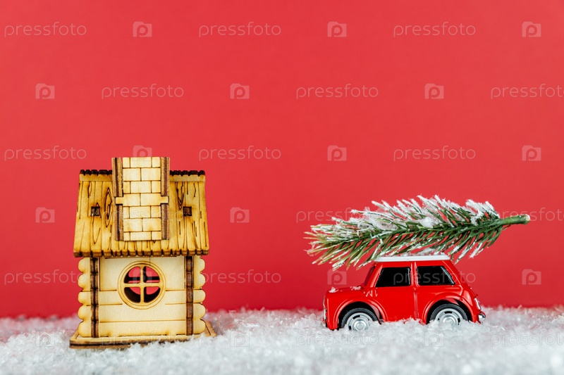 Маленький красный игрушечный автомобиль с елью на снежной дороге рядом с деревянным домом. Праздничная рождественская открытка