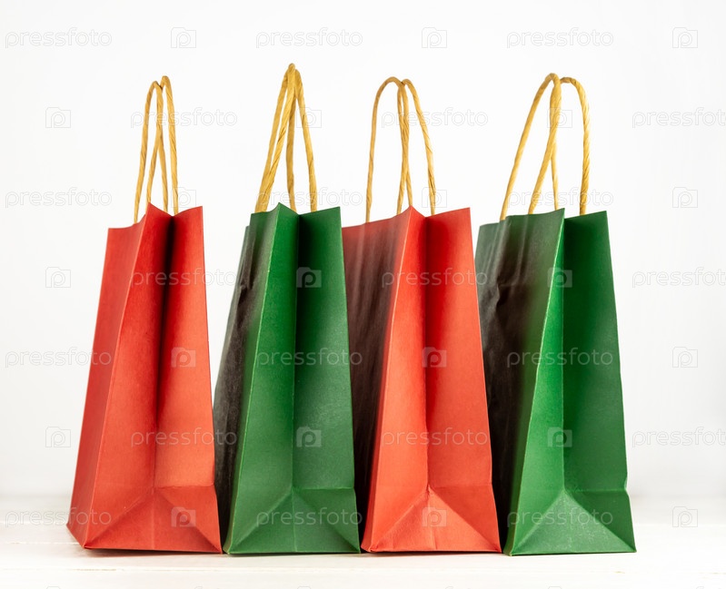 Набор сумок для покупок из крафт-бумаги в рождественском настроении. на белом фоне. Концепция покупок для зимних каникул