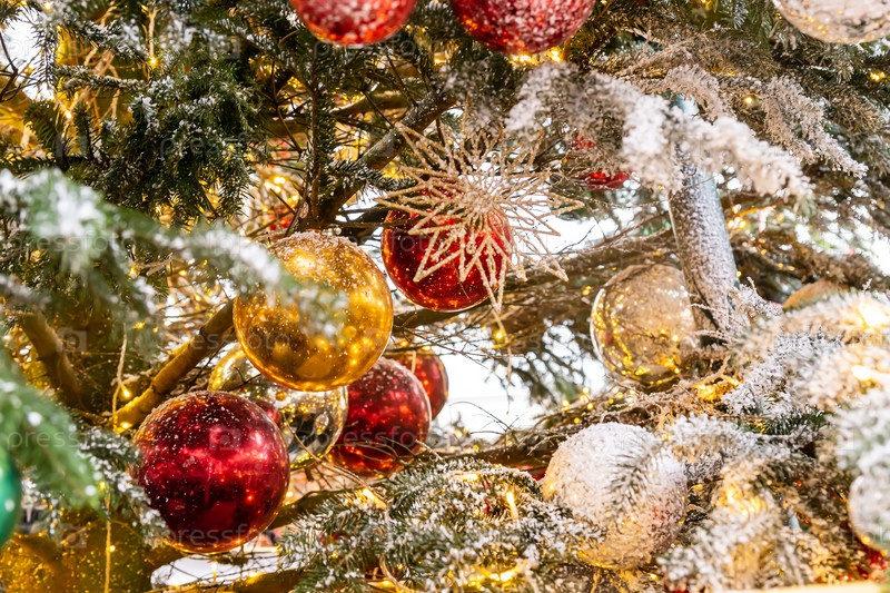 Закройте украшение елки безделушками и снежной глазурью. Праздничная открытка на зимние праздники в золотых тонах